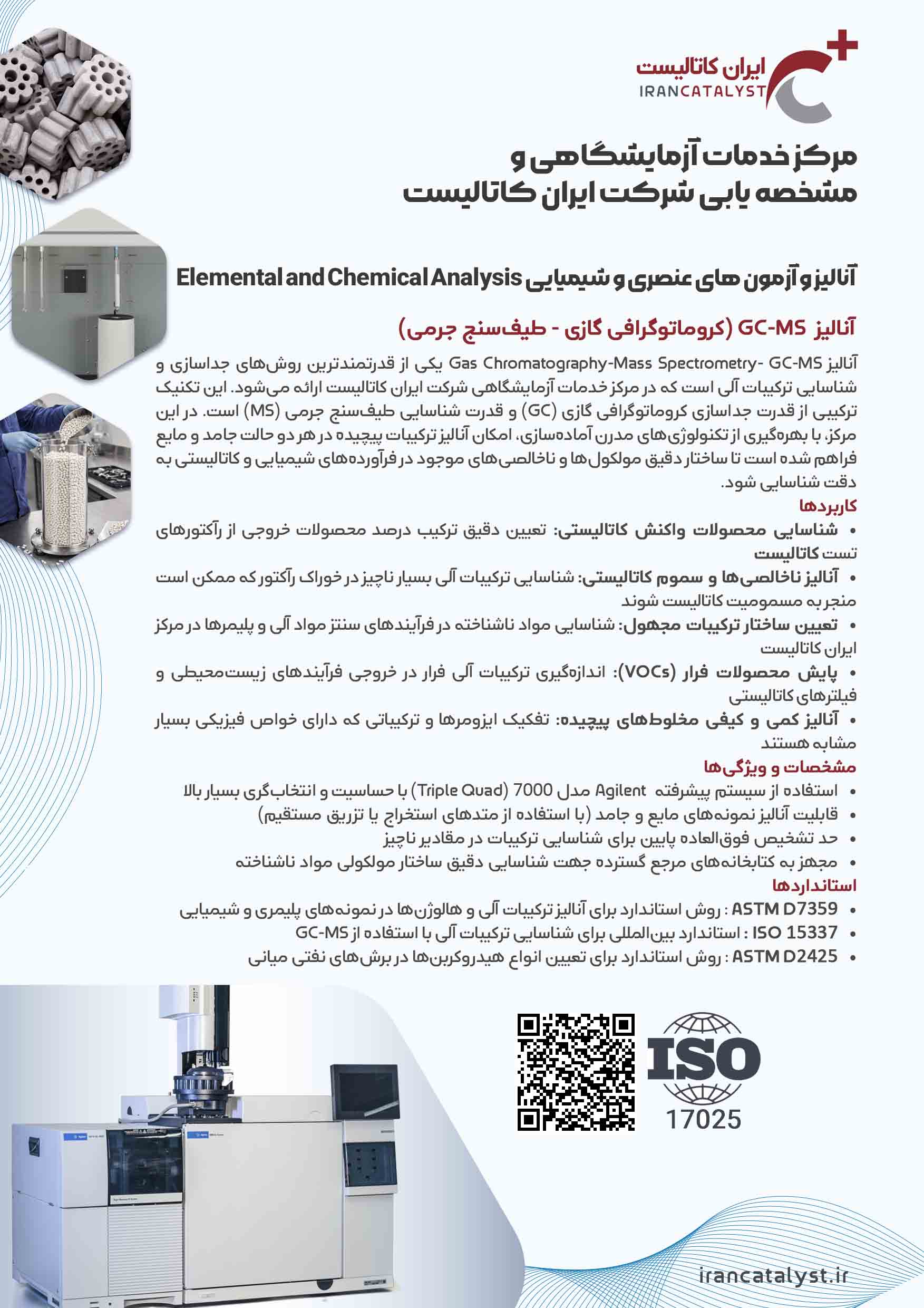 آنالیز (Gas Chromatography-Mass Spectrometry) GC-MS یکی از قدرتمندترین روشهای جداسازی و شناسایی ترکیبات آلی است که در مرکز خدمات آزمایشگاهی شرکت ایران کاتالیست ارائه میشود. این تکنیک ترکیبی از قدرت جداسازی کروماتوگرافی گازی (GC) و قدرت شناسایی طیفسنج جرمی (MS) است. در این مرکز، با بهرهگیری از تکنولوژیهای مدرن آمادهسازی، امکان آنالیز ترکیبات پیچیده در هر دو حالت جامد و مایع فراهم شده است تا ساختار دقیق مولکولها و ناخالصیهای موجود در فرآوردههای شیمیایی و کاتالیستی به دقت شناسایی شود.