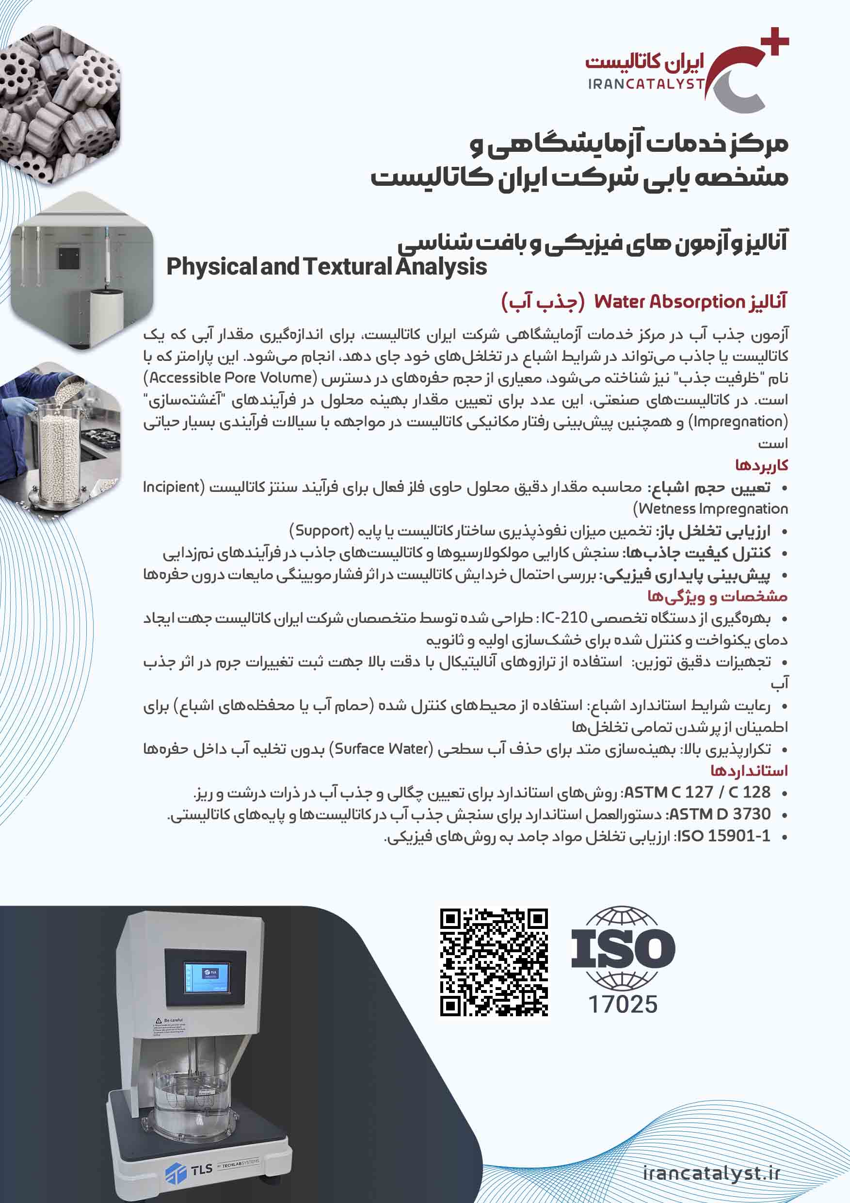 آزمون جذب آب در مرکز خدمات آزمایشگاهی شرکت ایران کاتالیست، برای اندازهگیری مقدار آبی که یک کاتالیست یا جاذب میتواند در شرایط اشباع در تخلخلهای خود جای دهد، انجام میشود. این پارامتر که با نام “ظرفیت جذب” نیز شناخته میشود، معیاری از حجم حفرههای در دسترس (Accessible Pore Volume) است. در کاتالیستهای صنعتی، این عدد برای تعیین مقدار بهینه محلول در فرآیندهای “آغشتهسازی” (Impregnation) و همچنین پیشبینی رفتار مکانیکی کاتالیست در مواجهه با سیالات فرآیندی بسیار حیاتی است